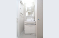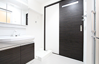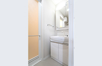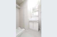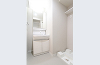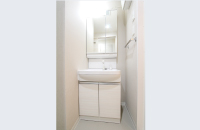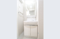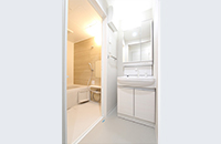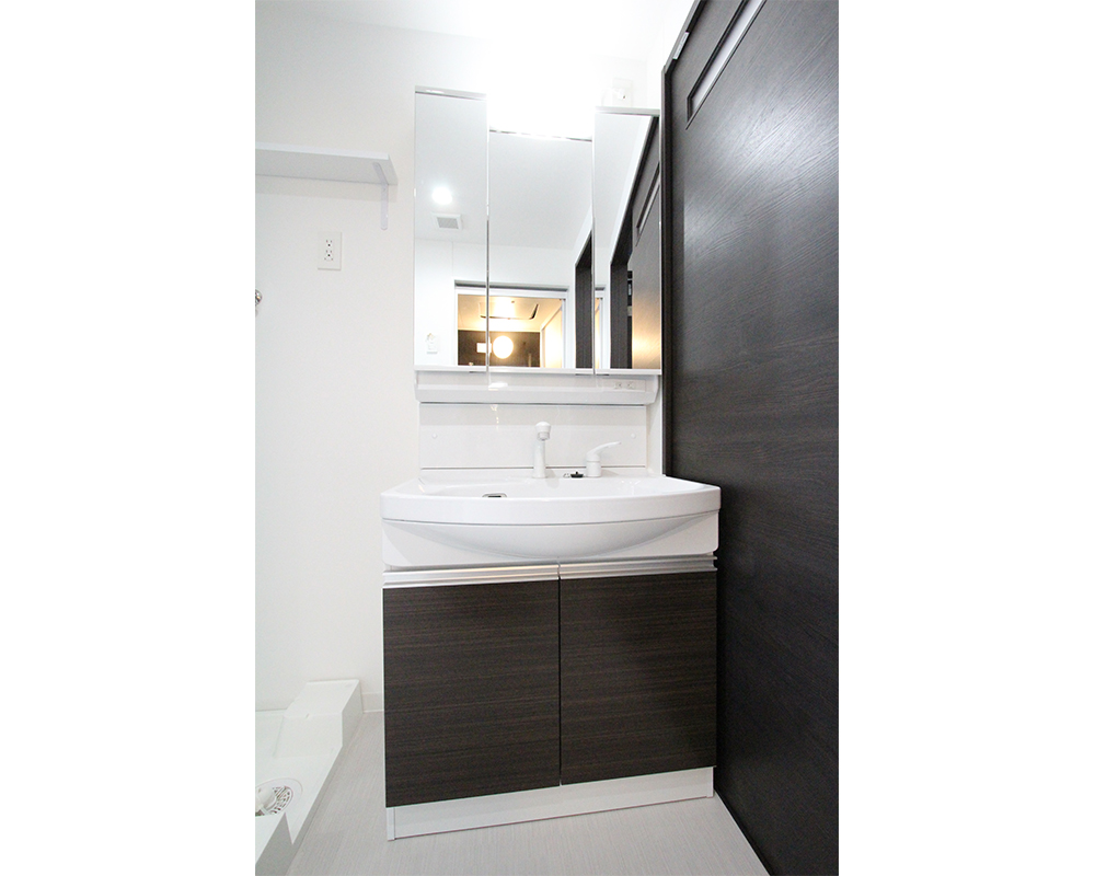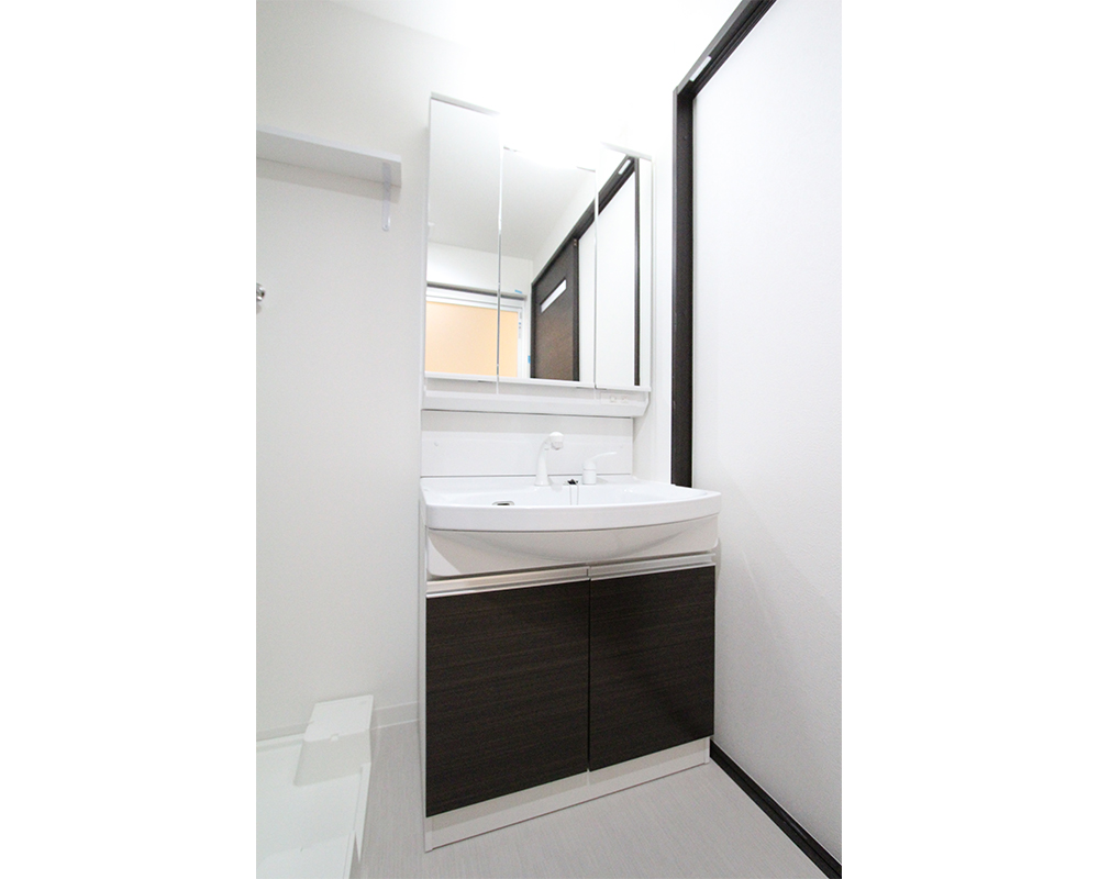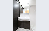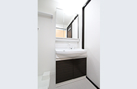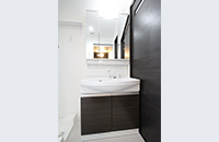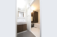 独立洗面台は鏡裏収納付きで小物類もすっきりまとまります。